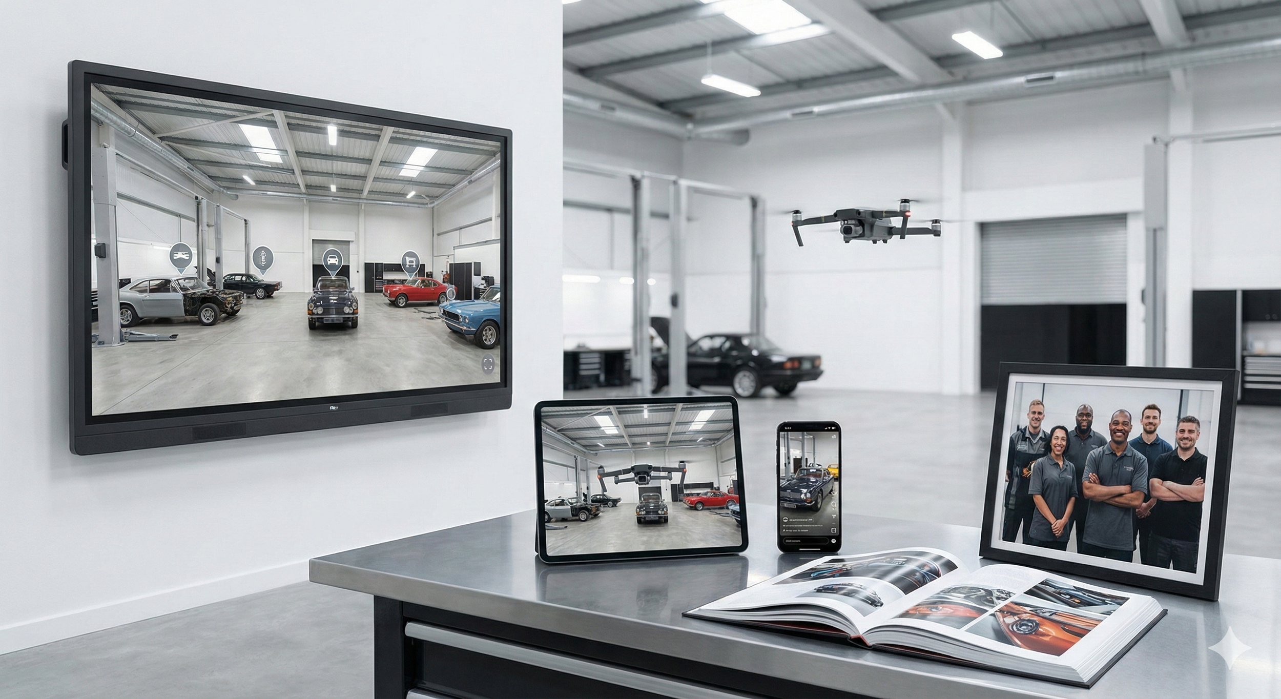 ✅ Vidéo Drone "Fly-Tru” (60-90 sec) : Vol cinématique spectaculaire qui traverse l'atelier, passe entre les ponts et survole les établis.